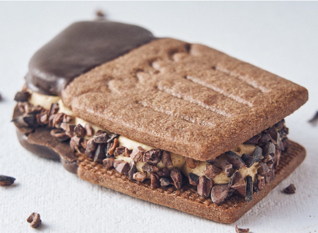 滑らかな口どけでセイボリーな “塩キャラメル生バタークリーム” の周りには、栄養価の高いスーパーフード “カカオニブ” を散らし、パリパリ食感とほろ苦さのアクセントが光る職人こだわりのひと手間を加えています。焙煎して砕いた芳ばしいカカオニブを使用し、カカオ特有の香り立つ味わいと心地の良いユニークな食感が楽しめます。コーヒーや紅茶はもちろん、ワインとの相性も抜群な大人も喜ぶ贅沢生バターサンドです。
