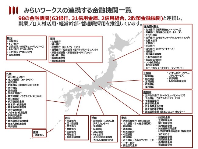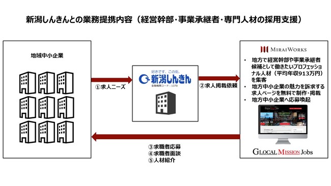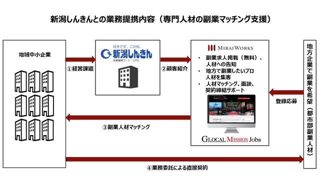 株式会社みらいワークス(本社:東京都港区、代表取締役社長 岡本祥治、以下「当社」)は、新潟信用金庫(本店:新潟県新潟市、理事長 小松茂樹、以下「新潟しんきん」)と人材支援による地域企業の事業強化を目的とした業務提携契約を締結したことをお知らせいたします。また、今回の新潟しんきんとの提携をもって、98の地域金融機関と地方転職・副業人材の活用を推進することとなります。