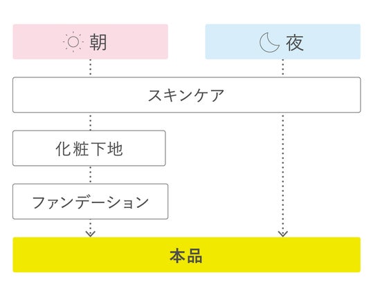 〇スキンケアの最後のお手入れとして、乳液やクリームなどをよくなじませたあとに塗布します。メイクアップ化粧品としてお使いになるときは、より美しい仕上がりのために、日やけ止め・化粧下地・ファンデーションのあとにお使いいただくことをおすすめします。