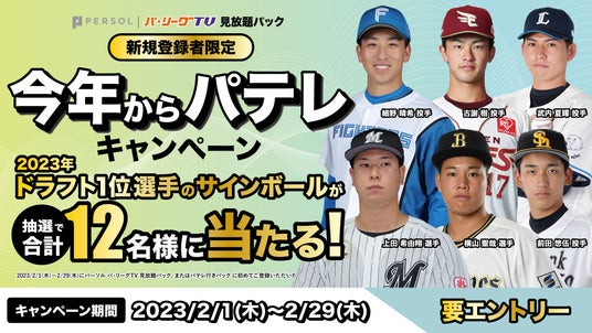 パシフィックリーグマーケティング株式会社(本社:東京都中央区、代表取締役CEO:根岸 友喜)は、リーグ公式動画配信サービス「パーソル パ・リーグTV」において、2024年2月1日(木)~2月29日(木)の期間中にパーソル パ・リーグTV見放題パック、またはパテレ行きパックに初めてご登録いただいた方の中から抽選で、パ・リーグ6球団の2023年ドラフト1位選手のサインボールをプレゼントする「今年からパテレ」キャンペーンを開催することをご案内いたします。