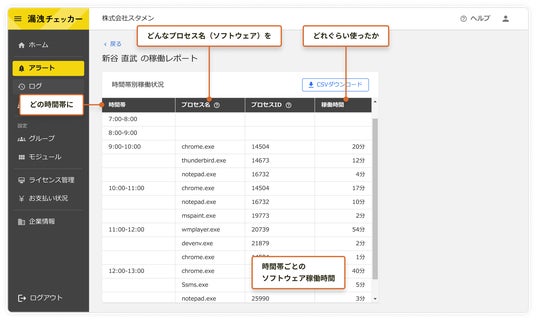 この新機能では、ソフトウェアごとの起動・終了ログを確認でき、端末ごとのソフトウェア稼働状況を日次レポートとして提供します。