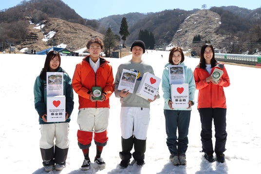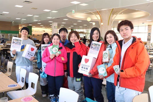 「ワールカップ、世界選手権、オリンピック日本代表」として活躍のスキーアスリートの賛同を得て「募金活動」。左から「伊原遥香」選手、「小笹海成」選手、「松田颯」選手、「伊藤みき」さん、「伊藤あづさ」さん