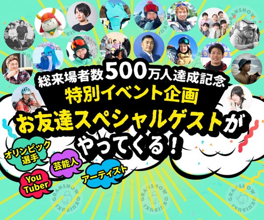 その他、総来場者数「500万人」達成に合わせた「お客様還元キャンペーン企画」も話題を集め、「ハワイ旅行やオリンピック選手からのスキーレッスンが当たるプレゼントキャンペーン」には「2460名」の応募が集まった他、グランスノー奥伊吹と繋がりをもつお友達ゲストとして、数多くの「芸能人やYouTuber、オリンピック選手らが来場」したことで更なる賑わいが生まれました。