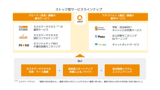 スタートアップ企業に対するグロース(成長)課題の解決サービスと、一般事業会社・学校法人に対するアダプション(適応)課題解決サービスといった2つの事業があります。