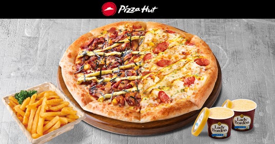 セット内容は、「直火焼 テリマヨチキン」と「ほっくりポテマヨソーセージ」というお子様たちに大人気の商品をハーフ&ハーフにしたピザ(Mサイズ)に、「ハットフライポテト(Mサイズ)」「レディーボーデン ミニカップ(バニラ2個)」という充実の内容。夏休み最後の思い出にも、宿題を頑張ったご褒美にも。もちろん、猛暑を乗り越え中の大人たちにも嬉しい味わいとなっております!