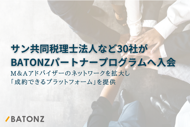 M&A総合支援プラットフォーム「BATONZ(バトンズ)」を運営する株式会社バトンズ(本社:東京都中央区、代表取締役:神瀬 悠一、以下バトンズ)は、新たに30社のM&Aアドバイザーが2023年6月27日から7月17日の期間にバトンズパートナープログラムへ入会したことをお知らせします。
