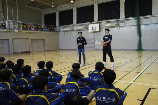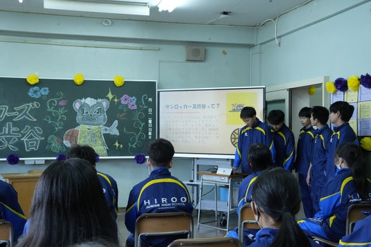 11月11日(月)#77 大森康瑛選手が渋谷区立広尾中学校2年生の探究学習を訪問し、生徒からプロジェクトのプレゼンテーションを受け、バスケットボールを通じた交流を行いました。
