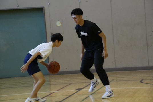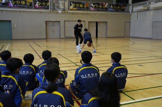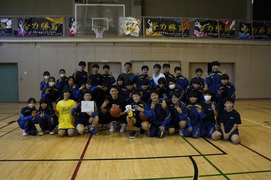 後半は場所を移動して体育館にて、バスケットボールを通じた生徒との交流を行いました。