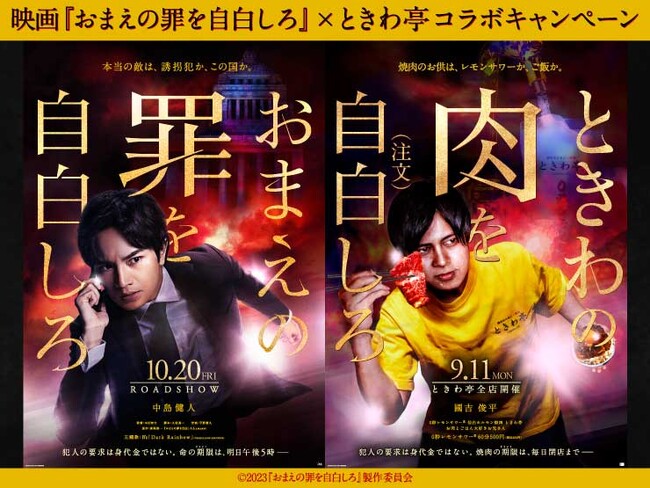 この度、10 月20日(金)全国公開のタイムリミットサスペンスを描いた映画『おまえの罪を自白しろ』とのタイアップして、『ときわの肉を自白(注文)しろ』キャンペーンを開催します。ときわ亭が映画とタイアップするのは今回が初となります。