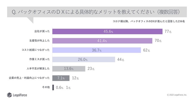 ・バックオフィスのDXが進んだことに対する具体的なメリットは「出社が減った」「生産性が向上した」
