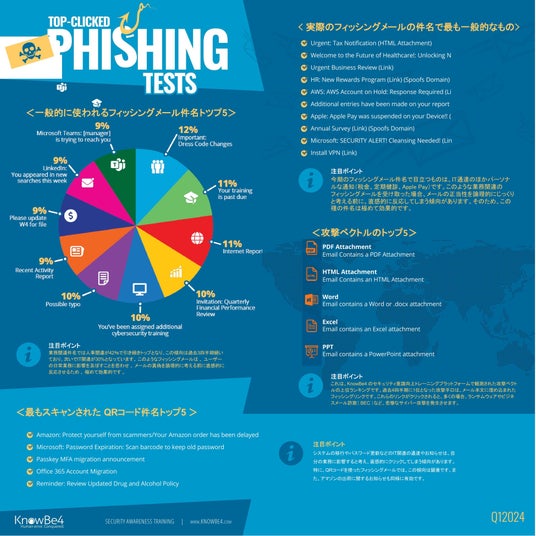 東京(2024年5月28日発)- セキュリティ意識向上トレーニングとフィッシングシミュレーション・分析を組み合わせた世界最大の統合型プラットフォームのプロバイダーであるKnowBe4(本社:米国フロリダ州タンパベイ、創立者兼CEO:Stu Sjouwerman (ストゥ・シャワーマン))は、2024年第1四半期のフィッシングテスト結果を発表しました。この結果には、フィッシングテストで最も多くクリックされたEメールの件名が示されており、人事またはIT関連のビジネスEメールはこれまで同様、多くの従業員の関心を惹きやすいことが明らかになりました。