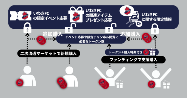 「いわきFCトークン」はいわきFCを支援する証であり、コミュニティでは投票を通じて企画に関わることができるほか、持ち続ける数量によって参加できるイベントやチャンネルが異なるなど、様々な場面でその効力を発揮するアイテムとなります。