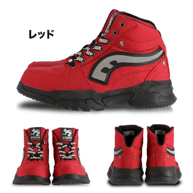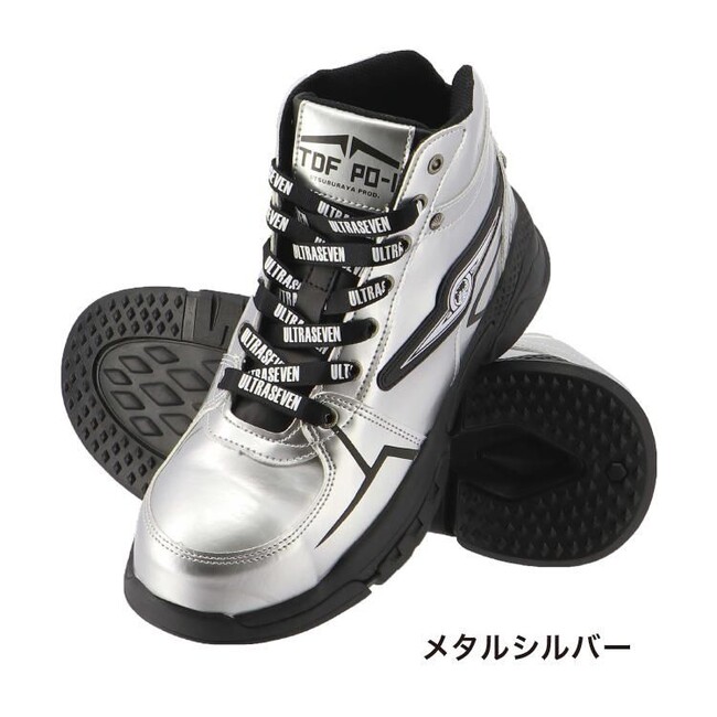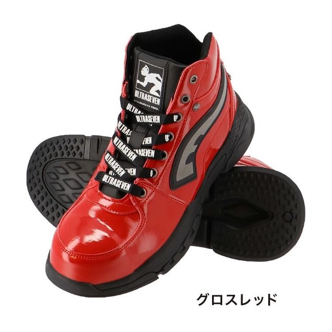 ウルトラセブン劇中内「ウルトラ警備隊」モデルと赤いウルトラなデザインが魅力的。アクセントのサイドマークは「アイスラッガー」をモチーフにした反射素材を使用しているセーフティスニーカー。