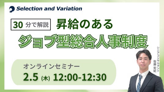 組織・人事コンサルティングファームであるセレクションアンドバリエーション株式会社(以下、当社、東京都千代田区丸の内、大阪市西区、名古屋市西区 / 代表取締役社長:平康慶浩/ URL:https://sele-vari.co.jp/ )は『【30分で解説】昇給のあるジョブ型総合人事制度』セミナーを2026年2月5日(木)12:00~12:30に開催することをお知らせいたします。