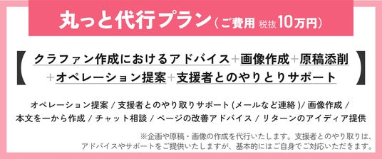 内容:クラウドファンディングページの作成、リターン案の提案、画像制作、マーケティング支援など
