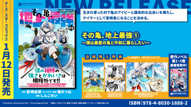 アース・スターノベルにて刊行中のノベルが原作で、現在コミック アース・スター公式サイトにて連載中の人気作品『その亀、地上最強 ~僕は最愛の亀と平和に暮らしたい~』(漫画:影崎由那 原作:しんこせい キャラクター原案:福きつね)第1巻を1月12日(金)に発売いたします。
