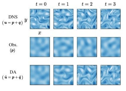 例えば、海流の予測を行う際に、人工衛星からのデータが利用できる場合を考えます。人工衛星の観測には解像度の限界があるため、大きな渦は解像できても、小さな渦を解像することはできません。流体の運動は、多くの場合は乱流(*1)なので、小さな渦に関して正確なデータがない場合、数値シミュレーションを行ってもすぐに予測が外れてしまいます(いわゆるバタフライ・エフェクト、*2)。そこで、大きな渦の観測データから小さな渦のデータを正確に復元する必要があり、それを可能にする応用数学的手法がデータ同化です。