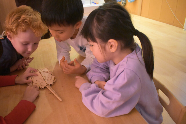 次に、日本の絶滅危惧種として「カブトガニ」が登場。カブトガニの住む干潟の埋め立てにより、年々数が減ってしまっていることを学びました。そして、カブトガニの特徴や生態を知るため、子どもたちの目の前に現れたのは“本物のカブトガニそっくり”の立体ウッドパズル。とげや脚など、細部までリアルなパズルに、子どもたちは夢中な様子でした。