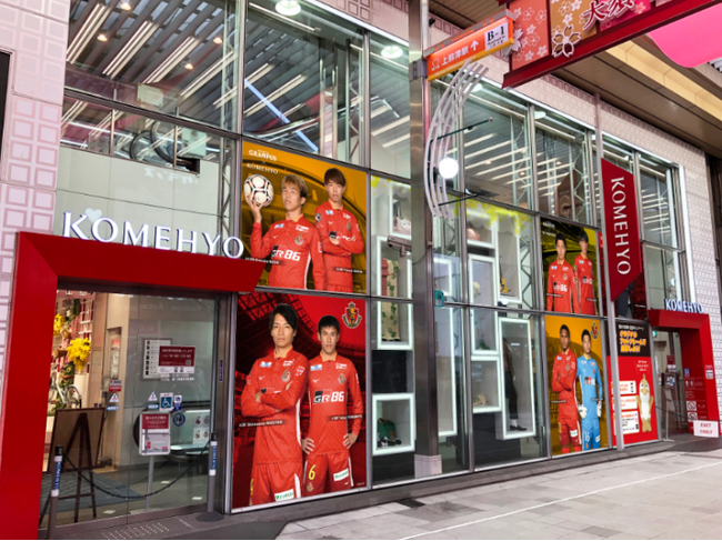 KOMEHYOが本社を構える名古屋市中区の大須商店街には、名古屋グランパスのオフィシャルショップ『クラブグランパス』があることから、名古屋グランパス、大須商店街、KOMEHYOが三位一体となって地域を盛り上げる取り組みをしてきました。今回は、「鯱の大祭典2023」開催のタイミングで、KOMEHYO名古屋本店本館に来店されるお客様はもちろん、大須商店街やスタジアムに来られた方に、優勝争いを続ける名古屋グランパスを後押しするための応援企画です。