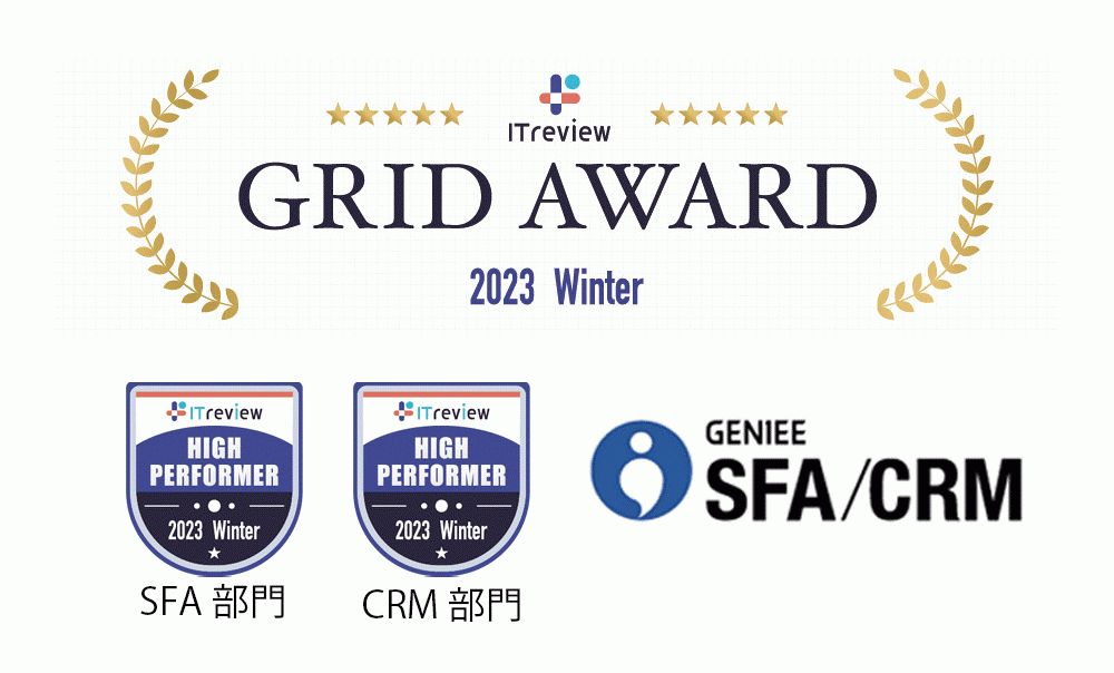 今回は、当社の営業管理ツール「GENIEE SFA/CRM」がITreview Grid Award 2023 Winterにおいて顧客満足度の優れた製品に贈られる「High Performer」をSFA部門、CRM部門の2部門にて受賞することができました。2018年10月~2022年12月までに掲載された10.3万件のレビューをもとに選ばれ、使いやすさや費用対効果の高さに対する好評価のコメントが多く寄せられました。