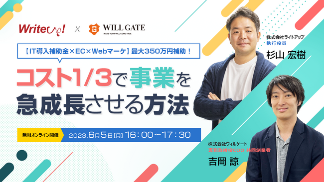 株式会社ウィルゲート(本社:東京都港区、代表取締役:小島 梨揮)は、株式会社ライトアップ(本社:東京都渋谷区、代表取締役社長:白石崇)と合同で、『【IT導入補助金×EC×Webマーケ】最大350万円補助!コスト1/3で事業を急成長させる方法』をテーマにしたオンラインセミナーを6月5日(月)に開催いたします。(申し込み先:https://bit.ly/3IHBShO )
