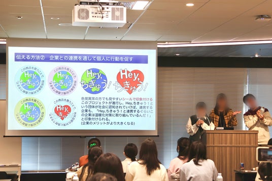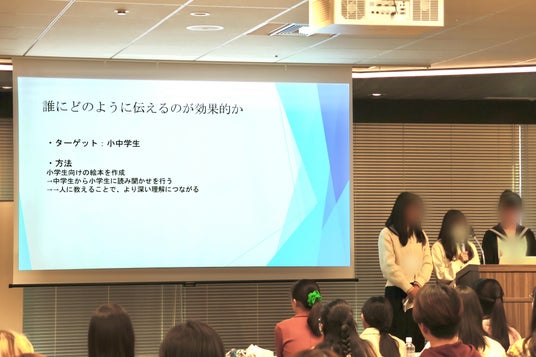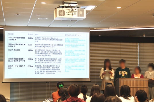 株式会社JERAや一般社団法人 教育環境デザイン研究所(CoREF)のほか、中高生の保護者など多くの大人が聞き手に回るなか、9チームはモニターに用意した資料を提示しながらプレゼンを行いました。