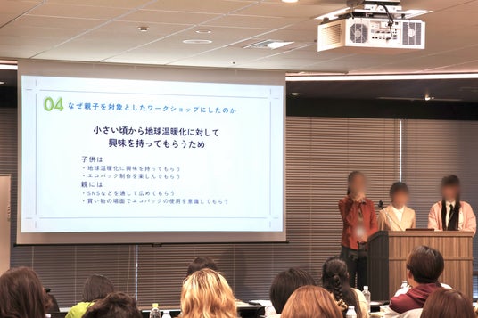 親子で参加できるエコバック制作ワークショップを中心に展開。直接的なビニール削減効果のほか、企業を巻き込みながら素材として古着の提供を受けるなど、周辺の関心を広めていくアプローチ。