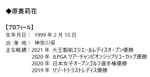 9月28日~10月1日に芦原ゴルフクラブ・海コース(福井県)で行われた国内女子メジャー「日本女子オープンゴルフ選手権」において、単独首位からスタートしたボール契約の原英莉花が、最終日1イーグル、3バーディ、1ボギーの68でプレーし、通算15アンダーとして国内女子メジャー3勝目、ツアー5勝目を挙げました。