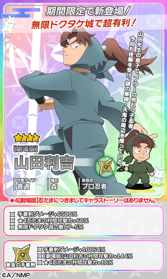 交換所に[劇場版]土井半助が登場!虹の札を使用することで、限界突破用の[劇場版]土井半助と交換できます。課題をプレイして虹の札をたくさん集め、キャラクターを強化しましょう!
