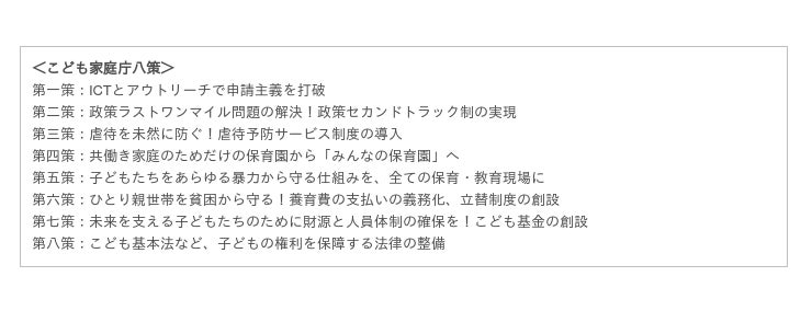 基本方針では、今後のこども政策の基本理念として、「誰一人取り残さず、抜け落ちることのない支援」を行うこととされました。様々な事情で支援を受けられていないこどもや家庭に対し社会がセーフティネットとなることが非常に大切です。こども家庭庁が司令塔になって強力に進めていただきたいです。