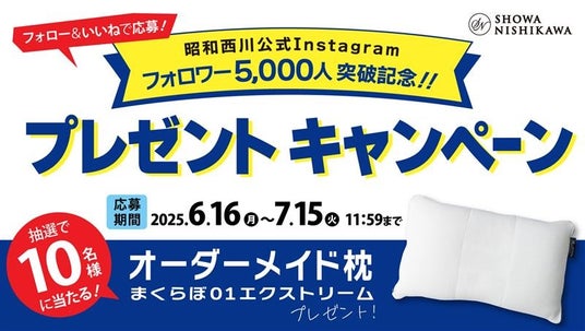 MuAtsu(ムアツ)を中心に様々な寝具を販売している昭和西川株式会社(本社:東京都中央区、代表:西川惠) が運営し、睡眠や寝具にまつわる情報をお届けする公式Instagramのフォロワー5,000人達成を記念して、10名様にオーダーメイドまくらが当たるプレゼントキャンペーンを開催中です。