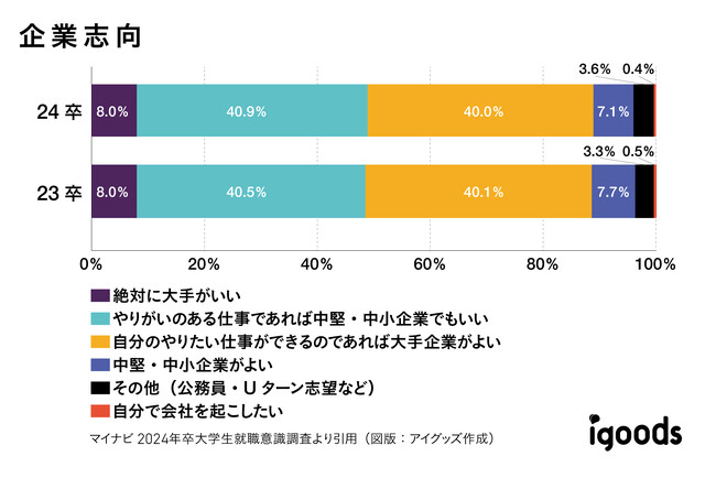株式会社マイナビの就職観に関する調査によると、最近2年間の就活生の傾向として、大手企業でなく中堅・中小企業を視野に入れる学生が半数を占めています。給与水準や福利厚生といった条件面・安定性以上に、仕事にやりがいや自身の成長幅を求める学生が多い傾向であることが見受けられます。
