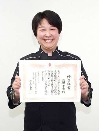 講演が終わり、いよいよ、修了証書授与式です。井上学長より一人ずつ名前が呼ばれ、修了証書と記念品のコックコートが手渡されると、周囲から惜しみない拍手が送られます。拍手を送った人が次は拍手を送られる側になり、お互いを“お祝いし合う”という状態。名前を呼ばれた人は、大きな拍手の中、少々恥ずかしそうに、でも誇らし気に、証書とコックコートをしっかり受け取っていました。