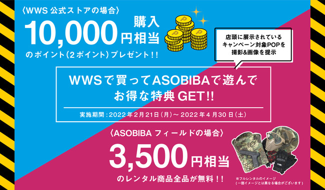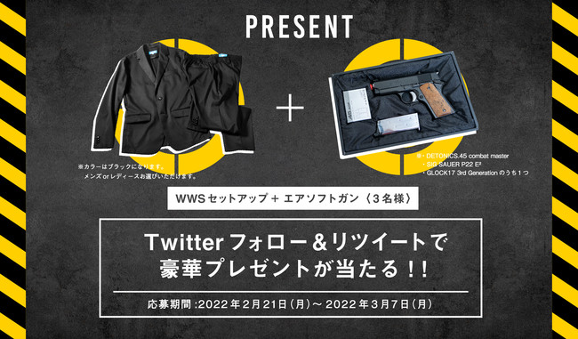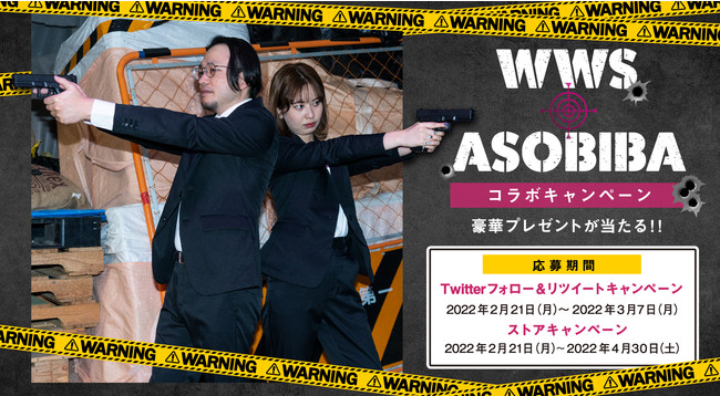 コラボ第一弾として、2022年2月21日(月)から「WWS×ASOBIBAコラボキャンペーン」を実施します。WWSセットアップとスーツに似合うエアソフトガンが抽選で3名様に当たる「Twitterフォロー&リツイートキャンペーン」は2月21日(月)から3月7日(月)まで。WWS公式ストア(Flagship Store新宿・八重洲地下街店)とASOBIBA店舗(秋葉原・池袋・新木場)にて双方の店舗に来店するとお得な特典がもらえる「ストアキャンペーン」は2月21日(月)~4月30日(土)の期間で実施いたします。