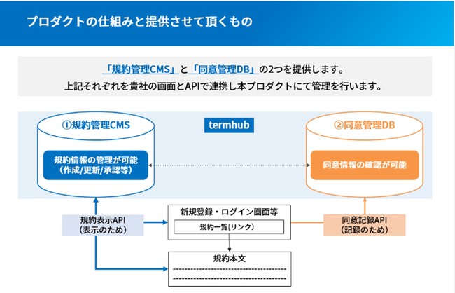 管理システムを用いることで、企業の法務などの管理部門が作成したウェブサイトの各規約の承認申請から掲出、更新までをワンストップで管理することが可能となります。また、各規約へのユーザーの同意情報はデータベースで管理され、必要に応じて企業が閲覧・出力することができます。