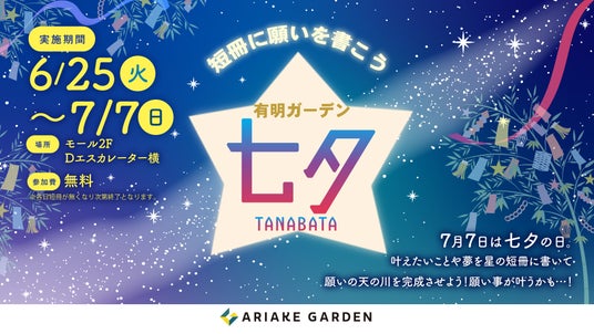 住友不動産商業マネジメント株式会社(本社:東京都新宿区 代表取締役社長:山本 直人)が、運営する複合商業施設「住友不動産 ショッピングシティ 有明ガーデン」(所在:東京都江東区)において実施する、七夕イベントについてお知らせいたします。