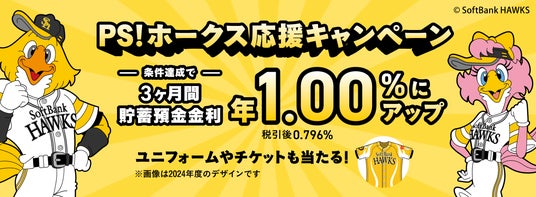 これを記念して、2025年4月1日(火) ~ 2025年8月31日(日)の期間に、特別金利として貯蓄預金金利年1.00%(税引後0.796%、3ヶ月間)適用やホークスグッズなどもあたる「ホークス応援Boxキャンペーン」を実施します。
