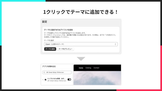 アプリをインストール後、1クリックでストアへのTikTokアイコンアプリブロックを追加できます。難しいコードの編集作業は一切必要ありません。アプリ管理画面から使用中のテーマを選択し、「テーマに追加」ボタンをクリックするだけで自動的にアプリブロックが組み込まれます。これにより、技術的なハードルなく、すぐにTikTok誘導機能をストアに実装できます。