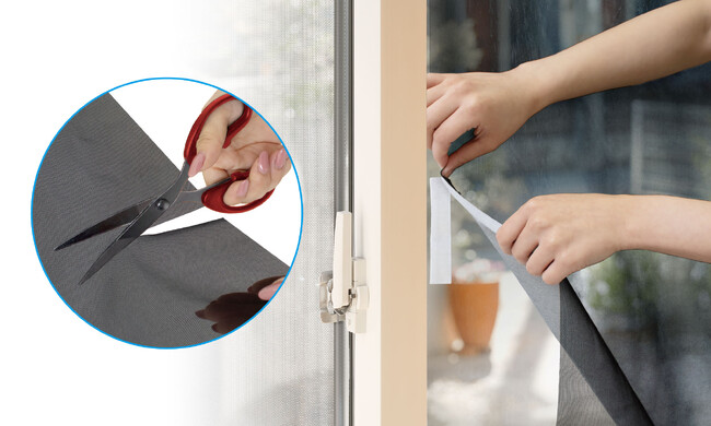 面ファスナーで取り付け簡単!メッシュシートは窓のサイズに合わせて、はさみでカットできます。