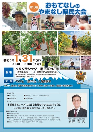 その一環として、毎年2月1日から7日を「おもてなし推進週間」と定め、同週間の始まりを前に「おもてなしのやまなし県民大会」を開催してきました。今年度は、「第13回おもてなしのやまなし県民大会」を次のとおり、1月31日(水)にベルクラシック甲府にて開催します。