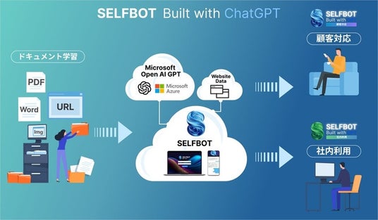 「SELFBOT」は、社内・社外問わずお問い合わせ対応の効率化に貢献するChatGPT連携のAIチャットボットサービスです。「SELFBOT」を導入することで、お客さまからの問い合わせやサポート対応などの業務負荷の軽減やコスト削減に貢献できます。