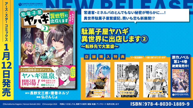 アース・スターノベルにて刊行中のノベルが原作で、現在コミック アース・スター公式サイトにて連載中の人気作品『駄菓子屋ヤハギ 異世界に出店します ~転移先で大繁盛~』(原作:長野文三郎・寝巻ネルゾ 漫画:仏さんじょ)第2巻を1月12日(金)に発売いたします。