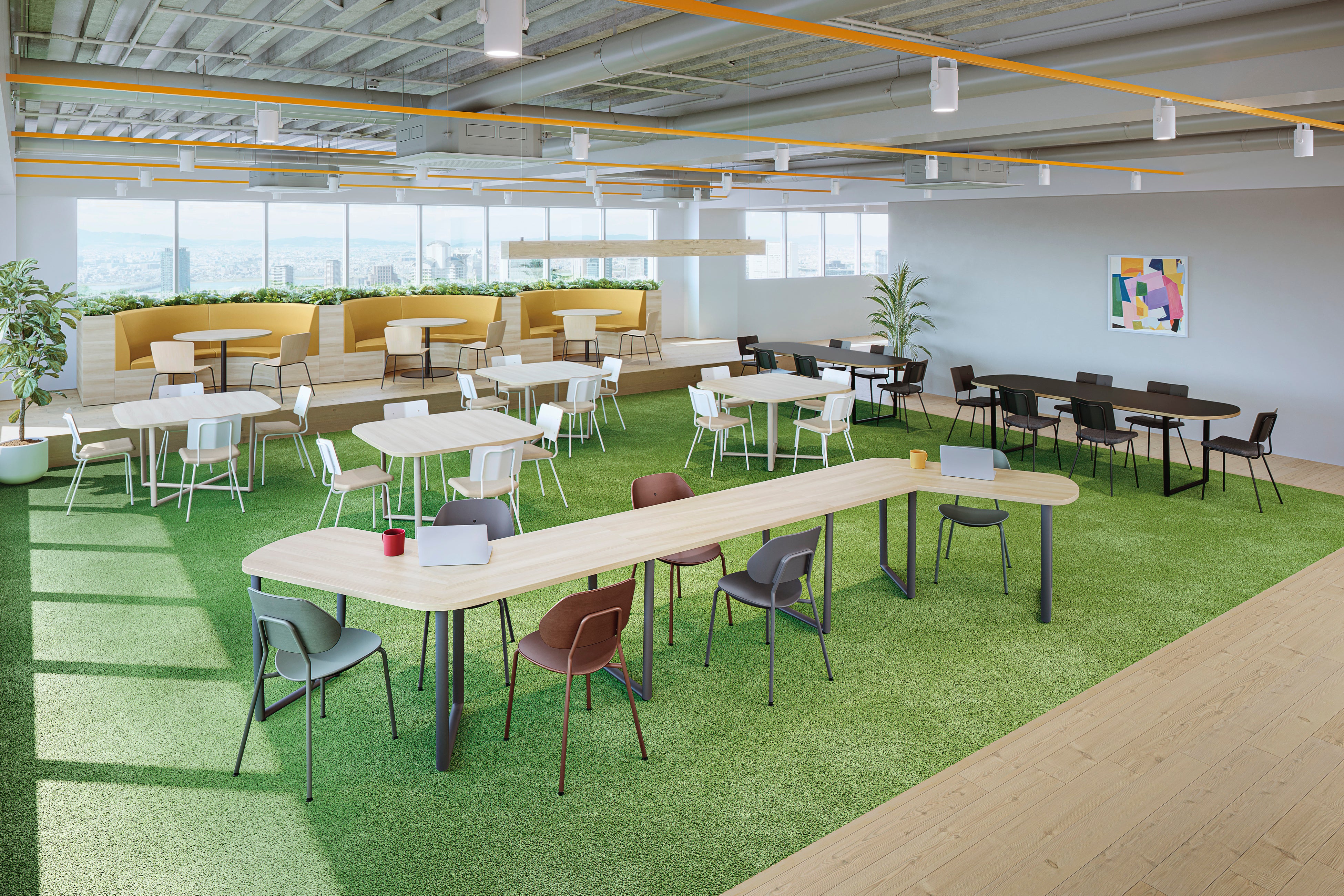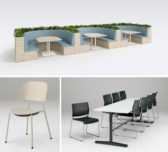 ユニットソファシリーズ「Bresta」U字ブースセット、カフェチェアシリーズ「Amita」樹脂タイプ、「Lives Meeting Table」ハンギングタイプ