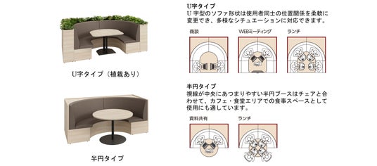 「Bresta」は、2019年に発売した、自由な組み合わせによりカフェのような居心地の良い空間をつくるソファシリーズです。ラウンド形状のソファで構成されるU字ブースセットをラインアップし、2025年12月より追加します。デザイントレンドでもあるラウンド形状のソファは、作業内容に合わせて使用者同士が適切な位置関係をとりやすいため、商談や面接、横並びでの資料共有、食事などさまざまなシチュエーションに対応できます。
