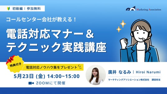 コールセンター代行サービスを提供するマーケティングアソシエーション株式会社(本社:東京都台東区 代表取締役:中園広和)は、2025年5月23日(金)に、ウェブセミナー『【コールセンター会社が教える!】電話対応マナー&テクニック実践講座』を開催します。