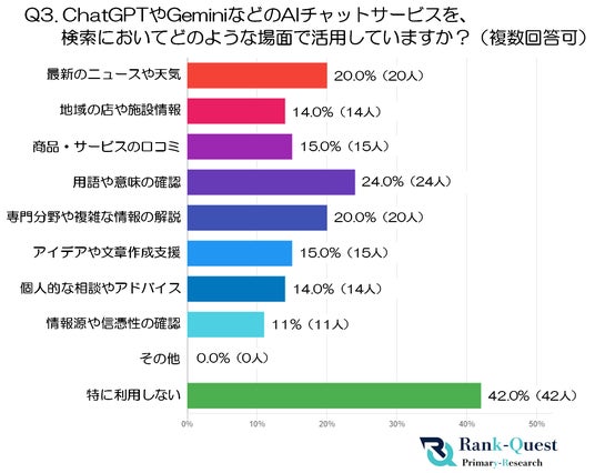 - また、「最新のニュースや天気」(20%・20人)や「専門分野や複雑な情報の解説」(20%・20人)も一定の割合で選ばれ、リアルタイムで情報を取得したい時や、難解な内容を理解する際に利用されていることが想像されます。