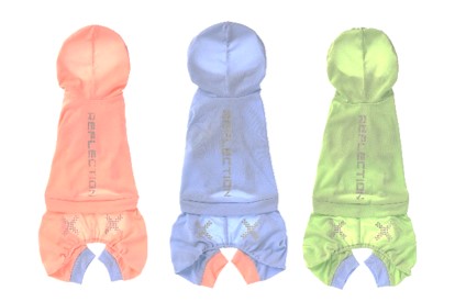 ・ 目付の軽い生地を使用し、ストレッチ性が優れているので、アクティブな愛犬の動きにもストレスを与えにくく、反射材加工を施しているので夜間時の自動車のヘッドライトに反射して存在を気づかせます。UVカット機能をプラスし、紫外線から愛犬の皮膚を守り、愛犬の顔周りを覆うことができるフードがあり皮膚が露出しづらいオールインワンセットアップタイプなので、愛犬の全身を夏の暑さや直射日光から守り、愛犬と一緒に夏のお散歩やアウトドアで活用することができます。