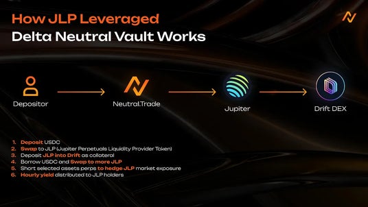 市場中立(デルタ・ニュートラル)戦略 により価格変動リスクを抑えつつ、Jupiter や Drift など主要 DEX から恒常的な取引手数料を獲得 すべてのポジションと履歴をチェーン上でリアルタイム公開する フル・オンチェーン透明性と Proof-of-Yield 預入額と保有期間に応じて将来トークンに交換可能な Neutral Trade Points(NTP)を自動付与するというという仕組みで、従来の CEX 依存型イールドサービスとは一線を画しています。
