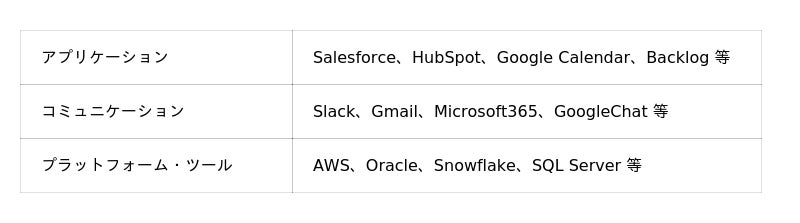 約50種類もの幅広いクラウドサービスとのMCPによる連携を提供。既存の業務環境を活かしてスムーズな連携、接続を実現します。提供外のサービスともカスタム設定で連携できます。