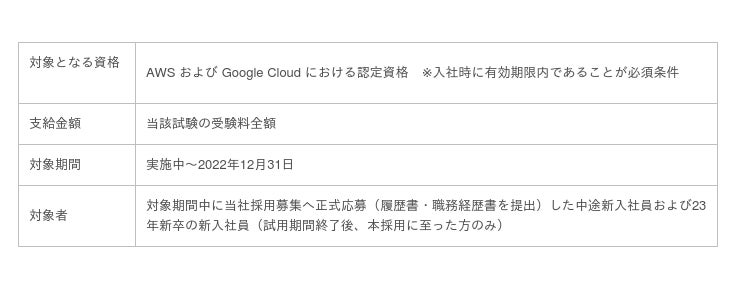 本制度は、中途および新卒の新入社員に対して、入社前に取得した アマゾン ウェブ サービス(AWS)および Google Cloud 認定資格の受験料全額を、入社後に一時金として支給するものです。